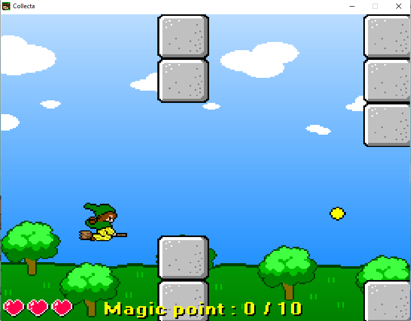 An apprentice witch named Collecta has set out to find magical orbs scattered in various places. To complete her advanced magic studies, she must use an old flying broomstick that is difficult to control. Will you be able to help her complete her mission?